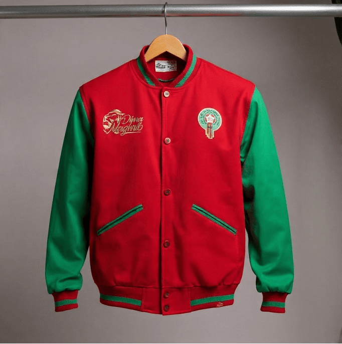 - نص ذهبي "#DimaMaghrib" - -شعار المنتخب الوطني المغربي- -اسم المغرب على ظهر الجاكيت بالعربية والامازيغية-